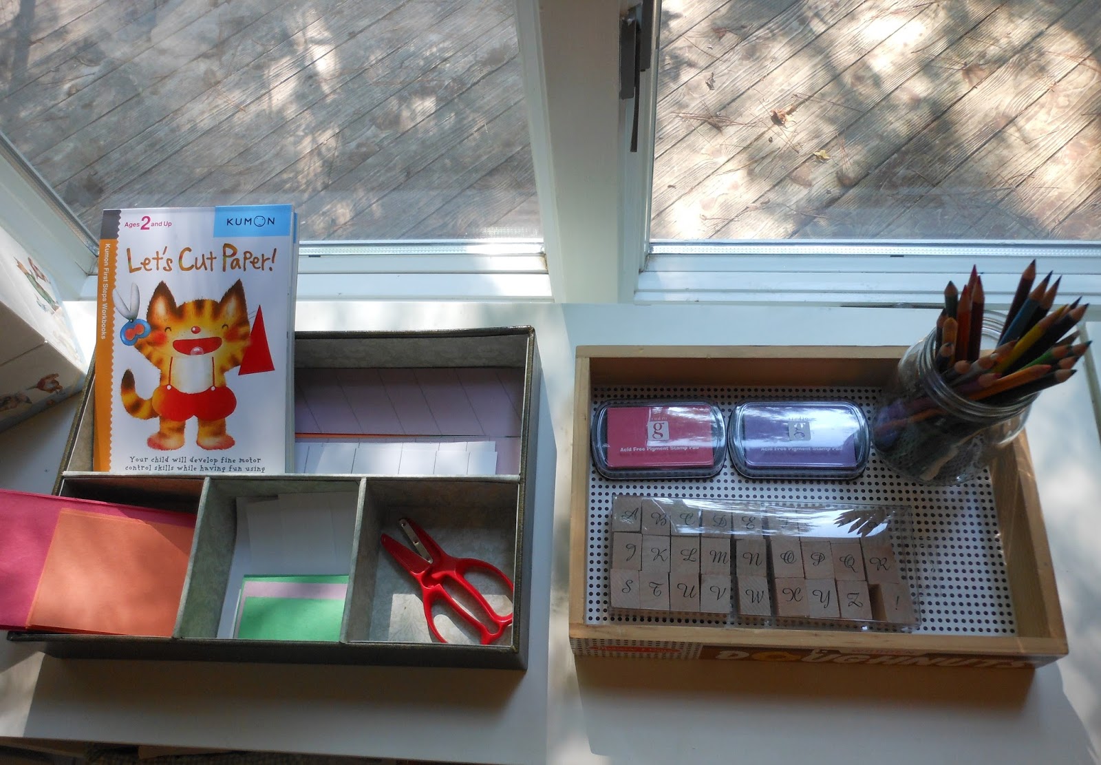 I’ve added a cutting and writing station complete with my favorite beginner scissors, these and these. Colored Pencils, alphabet stamps, and several different paper options.