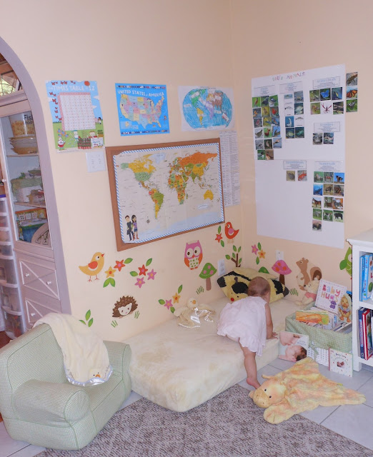 This is the view of the left side as you are looking in from the dining room. If you are wondering what is hanging from our light, that is our Solar system. With each unit study that we do we transform our room to incorporate our projects. I try to keep this room a calming yet inviting place to live, learn, and play. Enjoying a lifestyle of learning is important to me for my family. I hope you enjoyed touring our room today, come back anytime for a visit.