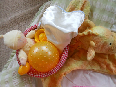 The blue basket had a Care bear, a cookie monster finger puppet, wooden blocks, stacking cups, rings, an egg shaker, a shaker ball, a ribbon, a book, and a soft handmade blanket.
