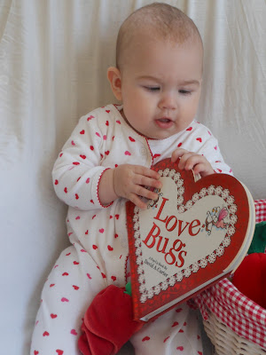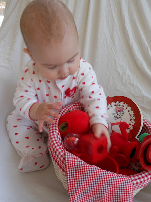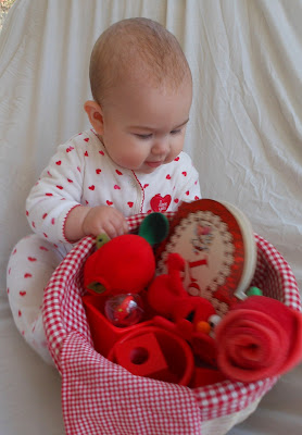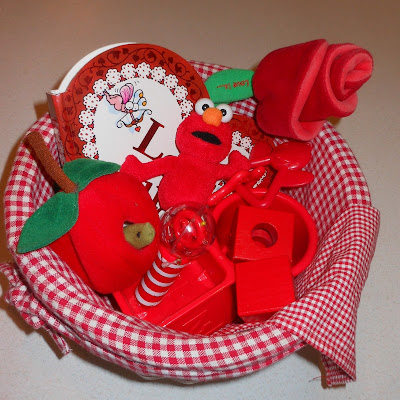 The red basket had the Love Bugs book, a rose, an apple puppet, wooden blocks, linking rings, stacking cups, a checked cloth, and Elmo.