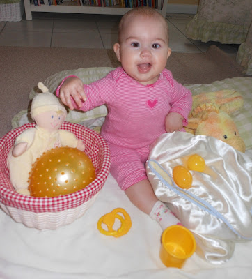Baby Bell has had so much fun exploring her color treasure baskets. Treasure baskets are a wonderful way for babies to explore and use their senses. Don’t you agree?